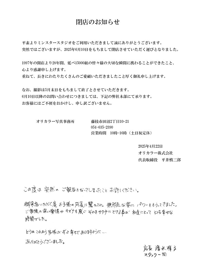 それまでは通常通り営業しておりますので、撮影をお考えのお客様、その他お問い合わせご相談等、遠慮なくご連絡ください。